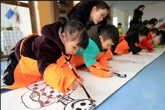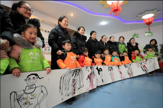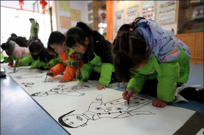 1月23日,安徽全椒县为迎接即将开幕的2018迎新春儿童水墨画展,孩子们集体创作一幅20米长卷,画出心中最美的老师。