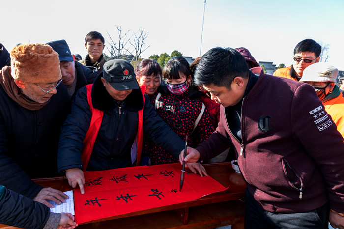 9时许,广场上早已人山人海,等候的人群自觉地排好队伍等待着领取老师们现场书写、饱含墨香的春联。两个小时的时间里,省、县二十余名书法家一丝不苟,手不释笔,为群众认真创作了近千幅春联和福字,受到了老百姓的一致好评。同时,县文联还免费向群众发放由安徽省文联印制的春联五百幅。