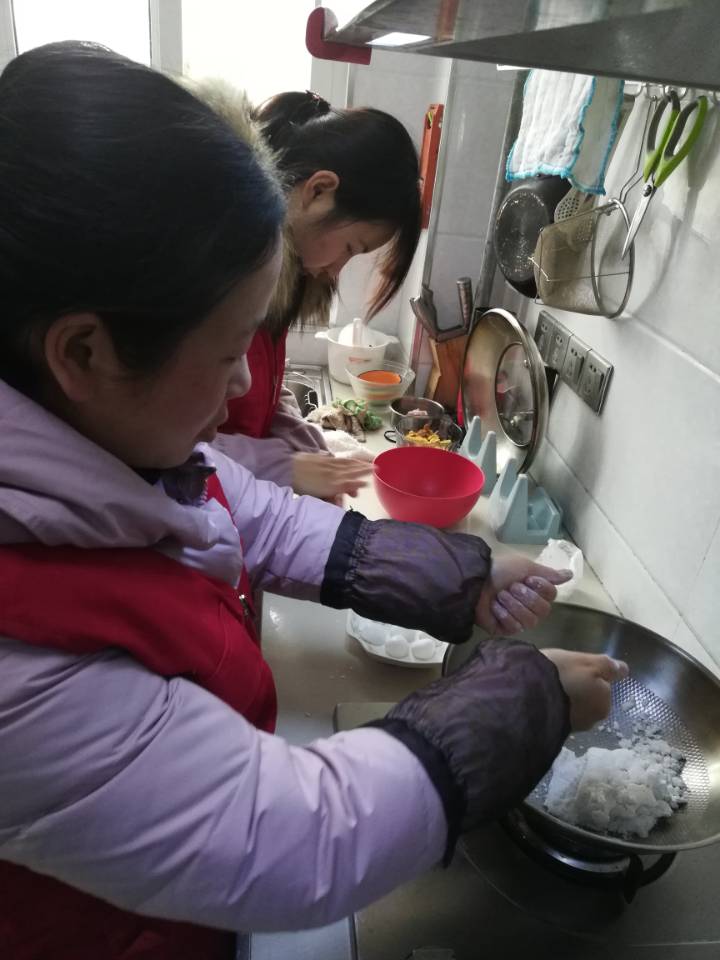 老人家中,城南社区党员、文明实践工作站志愿者、社区工作人员齐动手,洗菜、切菜、炒菜、搓元宵,大家的动作熟练麻利。志愿者们与老人促膝谈心、聊家常,现场一片欢声笑语。