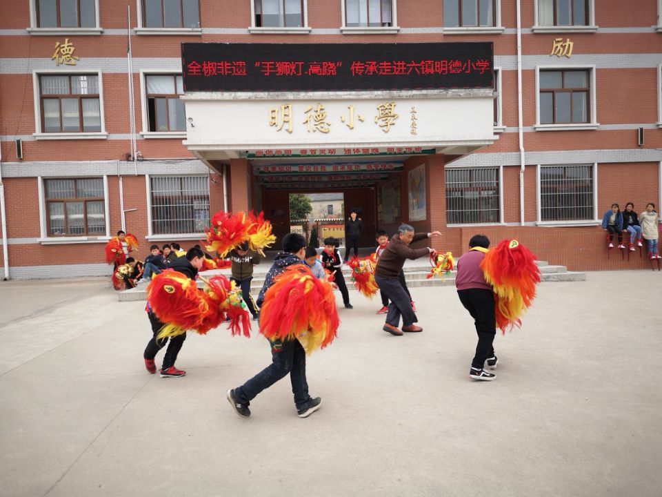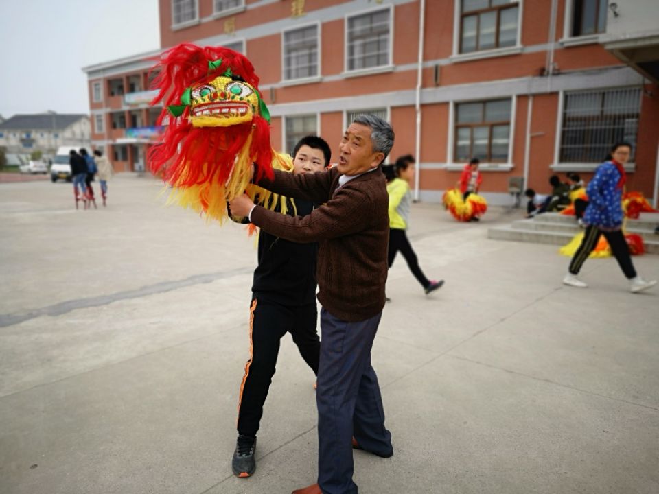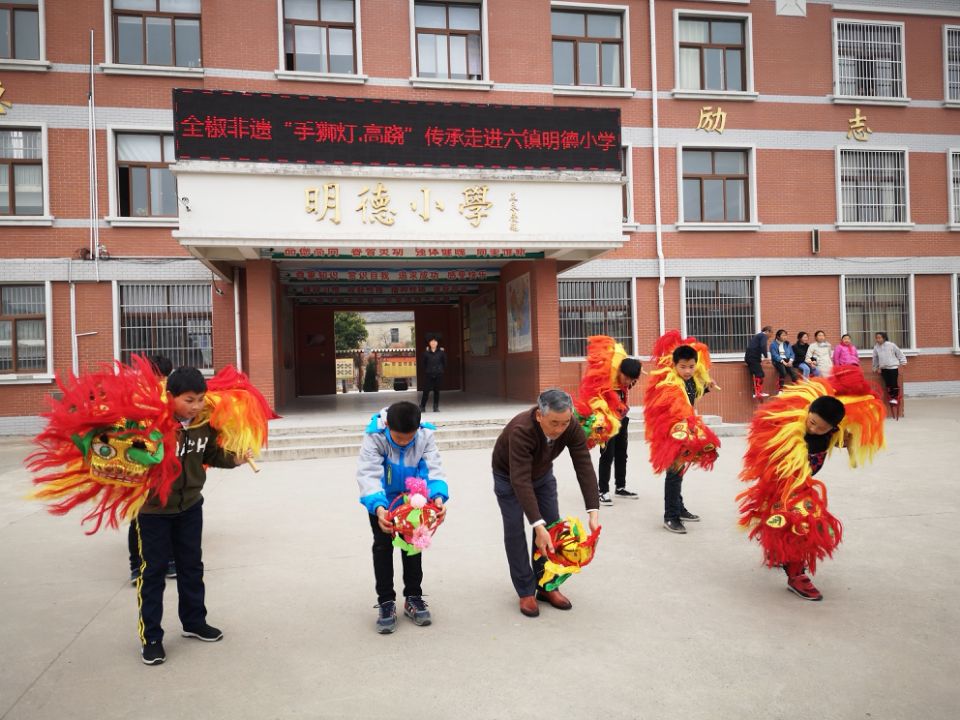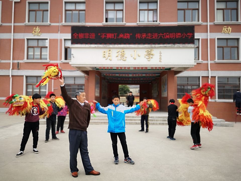 韩正平口中的课程是全椒县“非遗进校园”的一项内容,自该县启动这项活动以来,已经连续组织了多场非遗讲座,邀请各级非遗传承人向孩子们普及地区非遗成果,建立了6所非遗教育传习基地。韩正平每周二、周四下午一点到两点都在明德小学传授孩子们“手狮灯”的动作要领。只听韩正平口中高喊“呃”的号子,指挥着舞狮者不断变换动作,一会儿绕花,一会儿地趟,一会儿拜门子,可不热闹。六年级的王民学了才几天,已经可以上台表演。“小伢子们学起来快,有些高难度动作我做不了了,他们能做出来。”今年已经78岁的韩正平说。