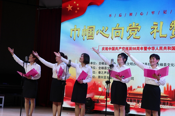 晚会开始前,现场全体党员干部起立,举起右手,庄严宣誓,重温入党誓词。随后,县妇联组织的公益合唱团唱响了红色经典歌曲《我的祖国》、《唱支山歌给党听》,晚会正式拉开帷幕。来自全县各行各业的妇女同胞以大合唱、朗诵、舞蹈、太极、声乐等形式,歌颂了伟大的党,赞美了强大的祖国。晚会现场掌声此起彼伏,整台晚会节目气势恢宏、歌舞交融。这是一台由广大妇女同胞自编自演的晚会;这是一台各行各业群众妇女讴歌党和祖国的晚会;这更是一台表达妇女同胞爱党爱国浓浓深情的晚会。最后,晚会在全椒县妇联合唱团和春之声少儿合唱团的《我和我的祖国》的嘹亮歌声中圆满结束。