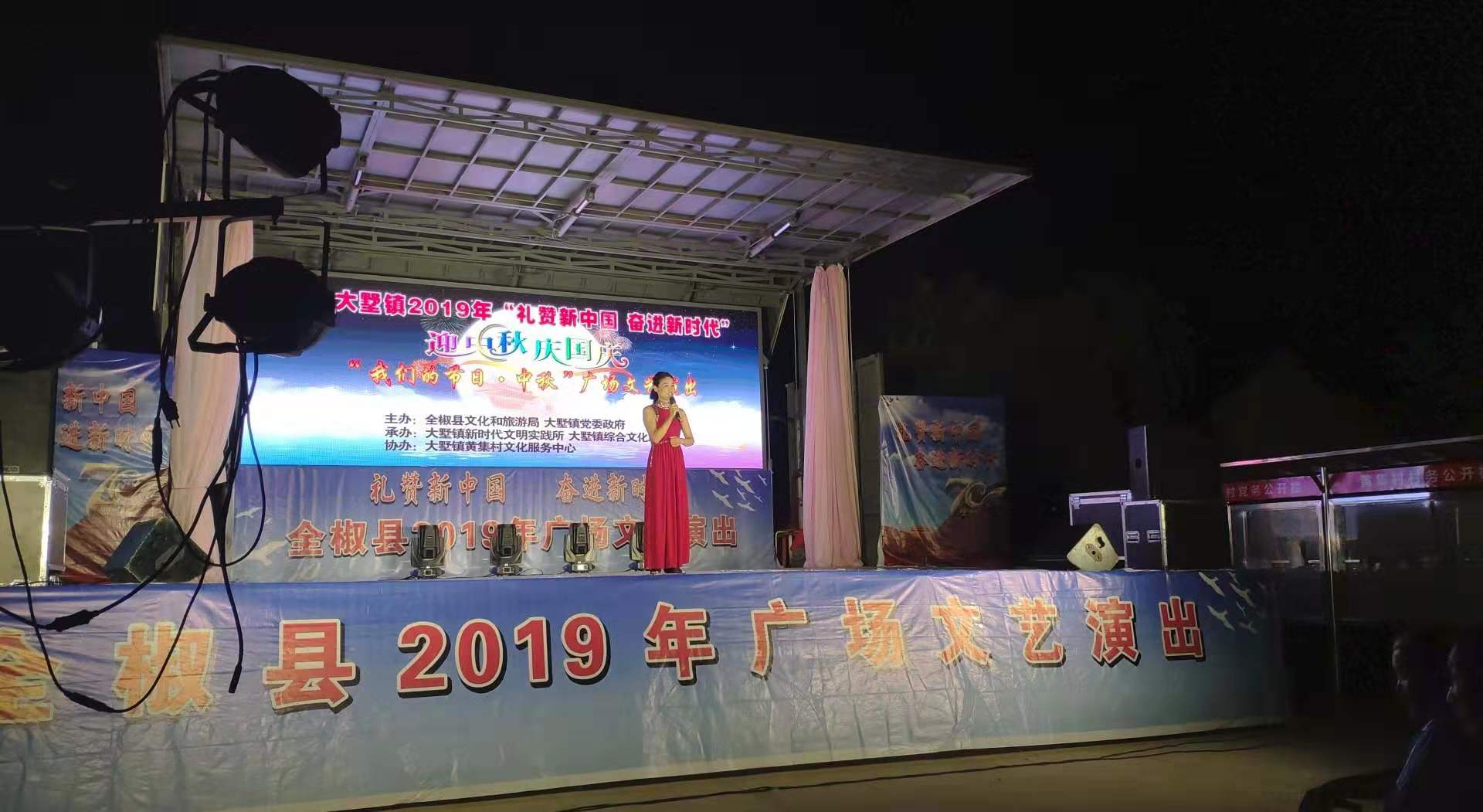 来自县文化传媒公司和大墅镇文艺团体50多人组成的表演队伍,精心编排了歌曲、舞蹈、戏曲、器乐等多个文艺节目演出。朗诵《新时代的声音》、小品《法律辩论赛》、歌曲《我的好兄弟》、戏曲《黄梅戏》、大合唱《少年中国梦》、乐器表演《滚滚长江东逝水》、乡间广场舞、民族舞等一个个喜庆而富有传统特色的节目,歌颂着伟大的祖国,礼赞着壮丽的70年,祝福着美好的新时代。这些来源于现实生活、形式多样、散发着泥土芬芳、接近农村基层的演出,丰富愉悦了中秋佳节期间农村广大干部群众的节日生活内容。