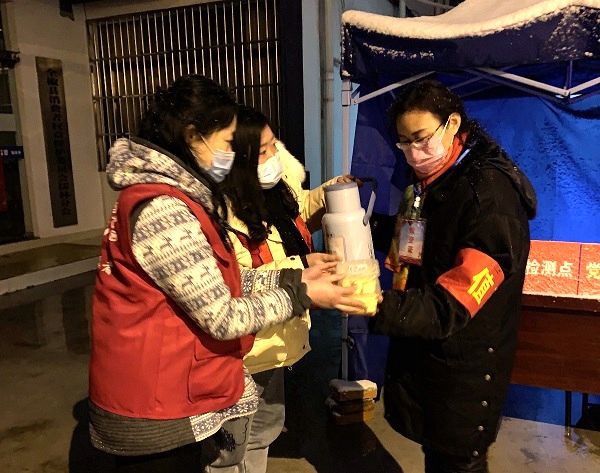 2月15日下午,大雪纷飞,地上很快就堆积了厚厚的积雪。晚上9点多,风雪中两个夜行人走向小区大门,执勤人员拿起额温枪迎上去,“您好,请配合工作量一下体温,再出示您的出入通行证”,测完体温,另一名执勤人员并开始登记两个人的信息。来人笑着说:“你们辛苦啦,给你们点赞”!说着并递上了帖有温暖姜汤和爱心点心标签的一只保温壶和两盒糕点五香蛋。执勤人员这时才注意到,她们身上穿着的四季莱茵大地幼儿园“青苗”志愿者红背心。她们表示,在这样特殊时期,这只是尽她们力所能及的一点心意。这姜茶是用生姜、红糖、红枣等熬制出来,点心和鸡蛋也刚做好还很热。姜茶暖身,点心暖胃,一杯热乎乎的姜茶驱走了冬日的寒冷。据了解,这一抹红每天2次出现在20多个封闭小区执勤点,直到战胜疫情,传递爱心,奉献温暖。
