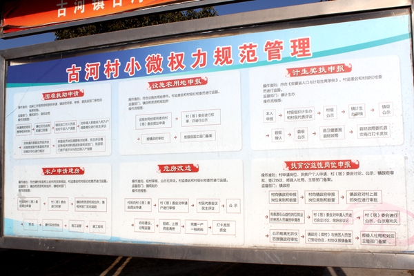完善村民自治,让村级事务在阳光下运行。古河村通过完善村民自治组织,健全村民自治机制,严格落实“四民主”,即民主选举、民主决策、民主管理、民主监督,汇集民智,集中民力,着力推进村民自治制度化、规范化、程序化。巩固提升村级小微权力规范管理,促使村级权力运行机制进一步完善。包括“三资”管理、工程项目、物资采购、公共服务、组织人事、三务公开6大类39项“小微权力”,143项权力责任,98个廉政风险点,135条防控措施,39张内容流程图,让规范管理有章可依、有险可防、有迹可循。对不按相关程序和流程行使权力的由村监会和干部群众监督提醒;对以权谋私、滥用职权、弄虚作假、逃避监督等违纪违规行为,镇纪委综合运用组织处理、党纪处分进行责任追究。自规范“小微权力”运行机制在古河镇运行以来,古河镇的干群关系、村民“参政议政”热情、基层干部的办事效率等都有了明显提升。