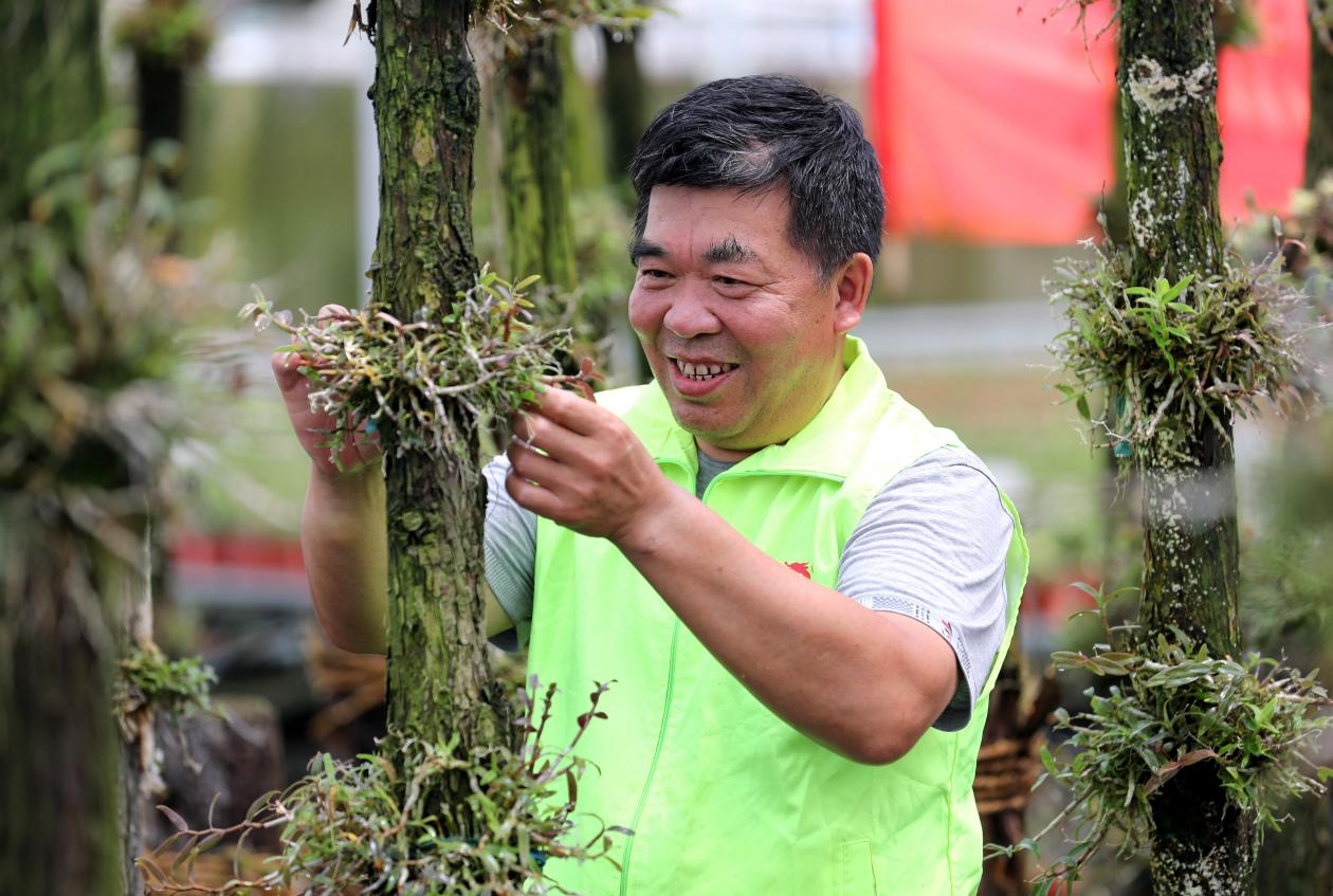 全椒县牧龙山铁皮石斛产业园,村民在管护原木种植的铁皮石斛。沈果摄