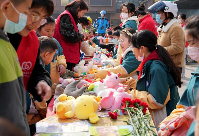义卖摊位有序摆在广场中央,商品琳琅满目,摆放着同学们精心准备的义卖物品,有悉心制作的手工作品、平时闲置的学习和生活用品、玩具等。在同学们卖力的吆喝声中,摊位前人头攒动,来往的居民群众挑选喜欢的义卖品,整个活动现场暖意涌动,格外热闹。