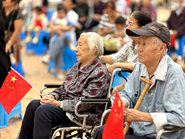 舞台下,居民们时不时拿出手机记录精彩瞬间。情到浓时掌声雷动,或伴着音乐一起共歌共舞,挥动小红旗祝愿祖国,小国旗在张张笑脸掩映下迎风招展,成为一道靓丽的风景线。