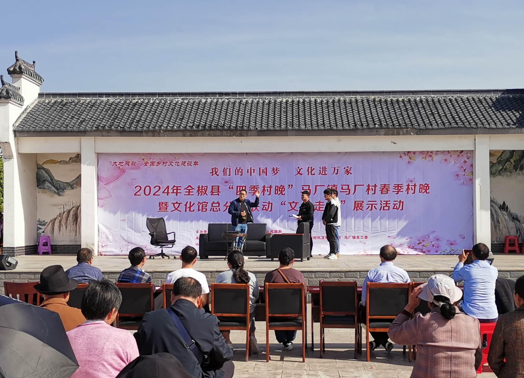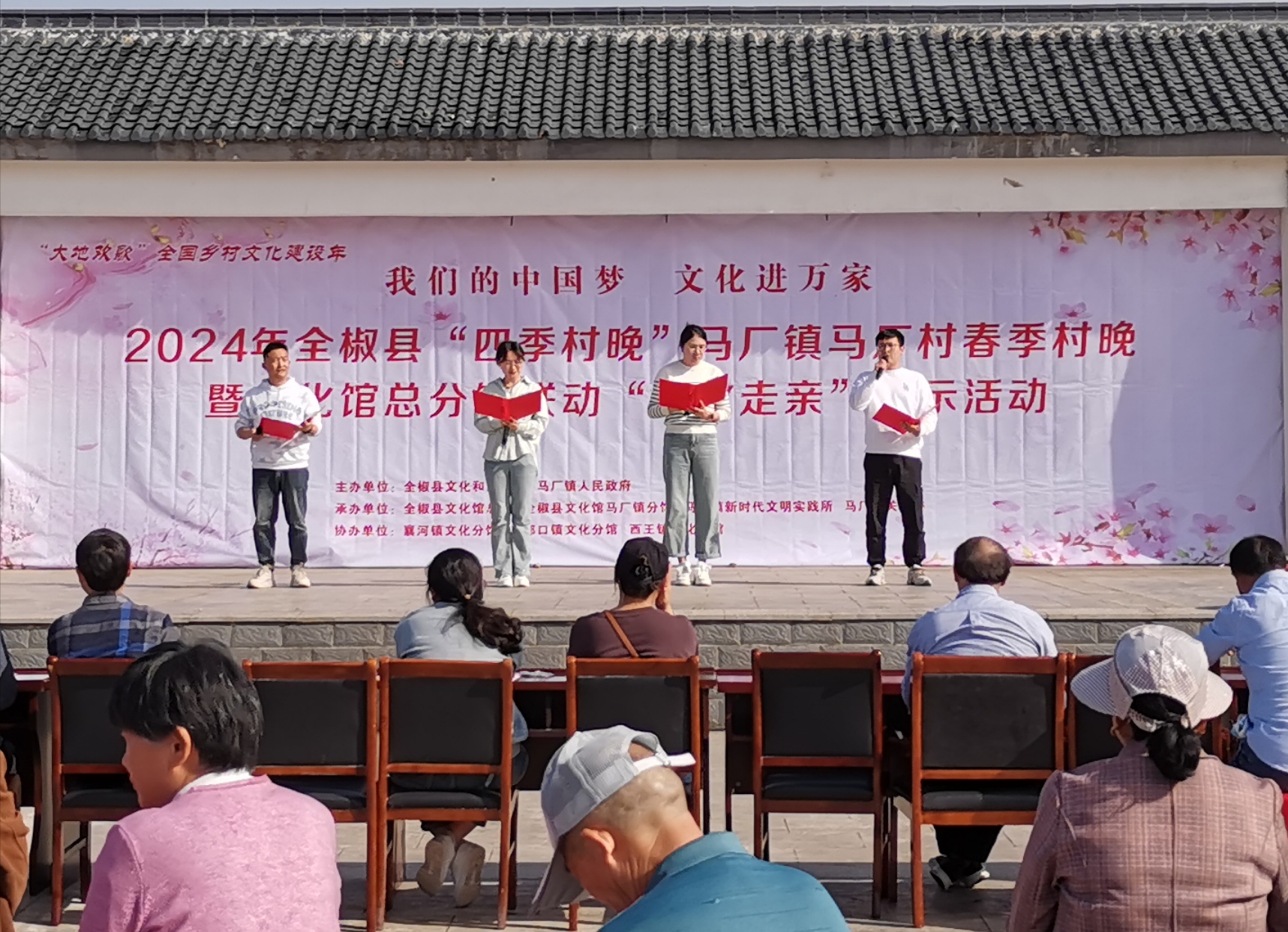 为激发乡村振兴的文化内生动力,传承与保护地方特色文化,丰富和活跃人民群众精神文化生活,4月18日,2024年全椒县“四季村晚”马厂镇马厂村春季村晚暨文化馆总分馆联动“文化走亲”展示活动在马厂镇新时代文明实践广场举行。